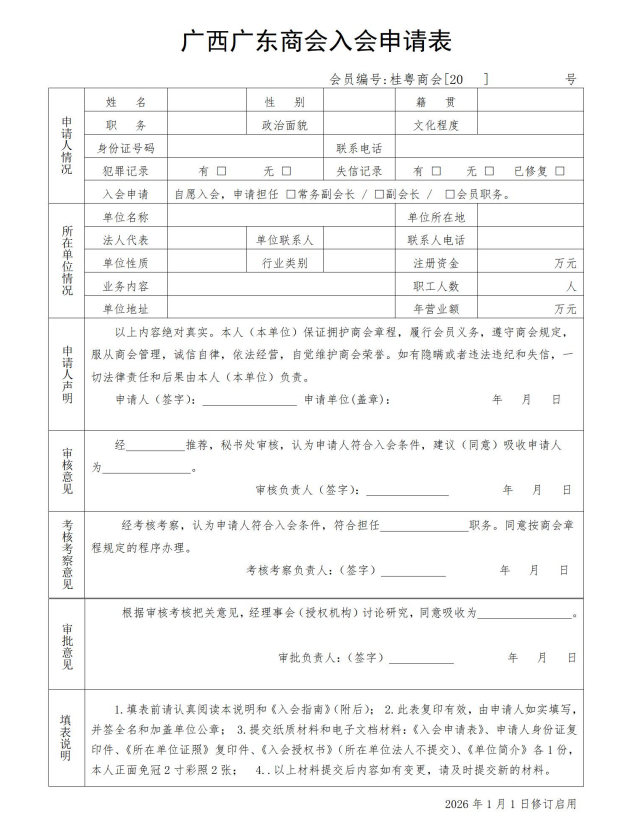 (一)提交《广西广东商会入会申请书》。本申请书为统一格式,可到商会秘书处领取或在网上下载自行打印,按表中内容逐项如实填写,并签名和加盖所在企业单位公章。